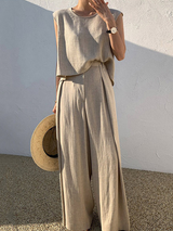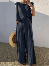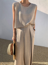 Chic and breathable, our 2-piece linen-cotton set features a sleeveless top and pants. Ideal for hot days, ensuring comfort and style.