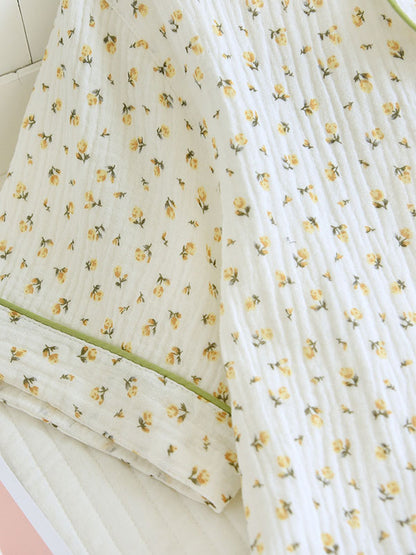 Bathed in soft light, a figure reclines in floral cotton pajamas, savoring a warm beverage. Nestled in plush surroundings, they embrace the serene comfort, feeling the gentle fabric, and admiring elegant floral patterns, drifting into blissful relaxation.