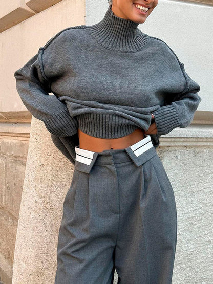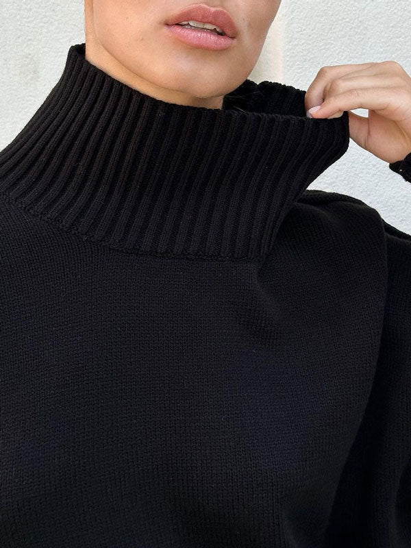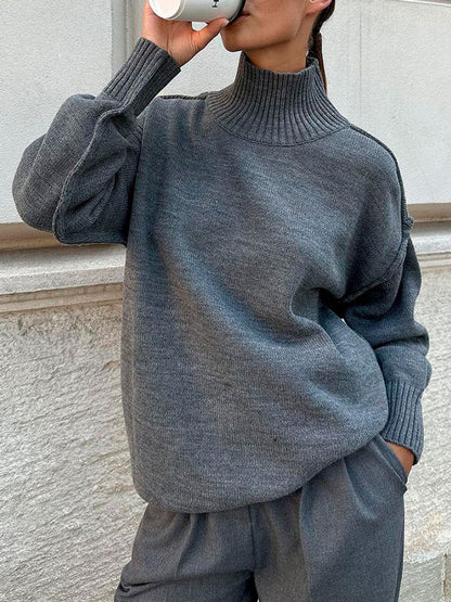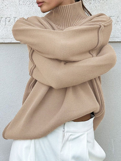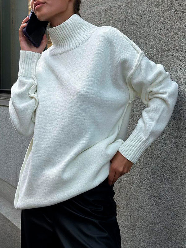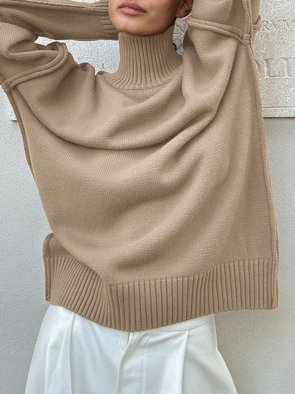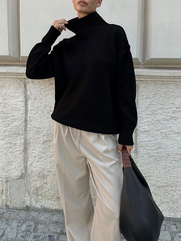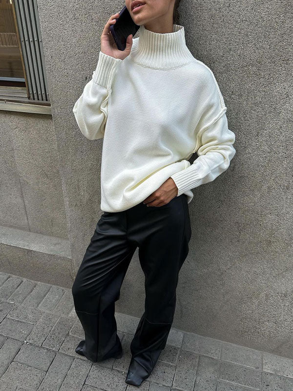 As the chill season sets in, cozy up in this versatile sweater, featuring a sleek turtleneck and a timeless silhouette. Its soft fabric and relaxed fit make it perfect for layering or wearing solo on cooler days.