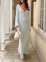 Are you ready for vaca? Elevate your getaway look with this chic long-sleeved maxi dress, showcasing an alluring open back design that adds a touch of elegance to your vacation ensemble.
