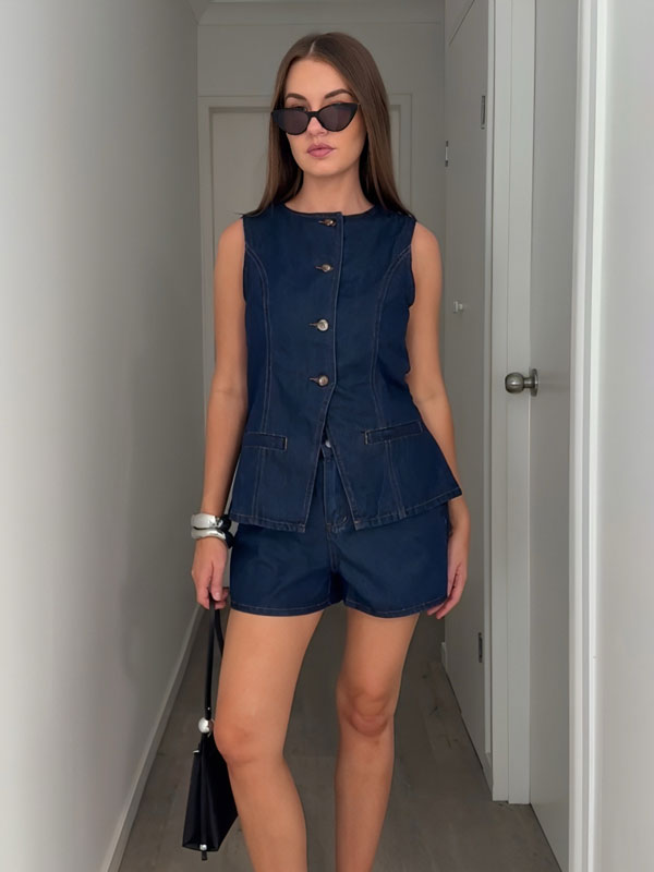 Perfect for casual outings, this denim set features a button-up top with rolled sleeves and matching high-waisted shorts. The classic blue wash and versatile design make it a stylish and comfortable choice for any occasion.