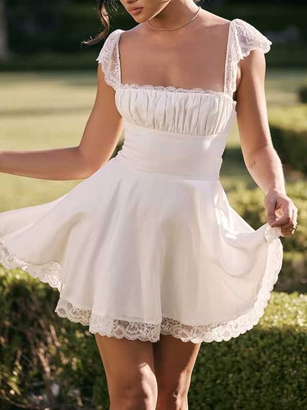 Channel ethereal beauty in this mesmerizing white mini dress, complete with enchanting lace sleeves that effortlessly elevate your style to new heights.