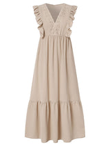 Designed for elegance, this women's maxi dress has a ruffle V-neck, sleeveless cut, and lace trim, and is available in plus sizes for a perfect fit.