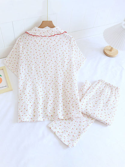 Cute florals and a soft ruffled collar make this pajama set perfect for winding down. Whether it’s a slow weekend morning or a relaxing day at home, comfort and charm come effortlessly.