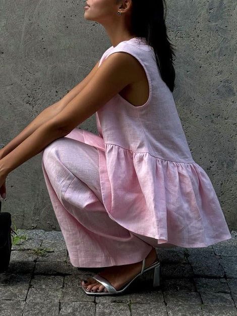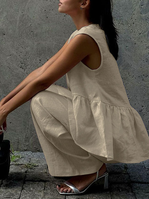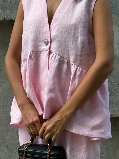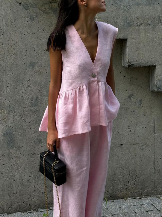 Designed for ease and elegance, this V-neck sleeveless vest and long pants set offers a versatile look that’s perfect for layering or wearing alone.